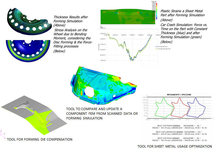 La soluzione: un applicativo che gestisce la compensazione dello stampo dal ritorno elastico, l'analisi di formatura 1-step, il calcolo dello spezzone minimo e del nesting, l'integrazione con l'ottimizzazione del prodotto, l'analisi geometrica e l'aggiornamento del modello della parte stampata in lamiera, la simulazione della graffatura, l'analisi delle tensioni residue e degli scostamenti dalla geometria nominale.